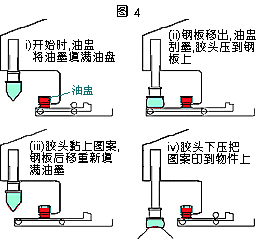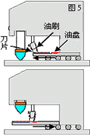 油墨在這機(jī)款中是放置于倒轉(zhuǎn)的密封式油盅里(圖4)。油盅緊貼于鋼板表面,令油墨不會(huì)漏出。同時(shí)間,油盅也有刀片的作用,在鋼板上來(lái)回移動(dòng),把油墨留在蝕刻圖案上。這裝置的好處是溶劑的揮發(fā)度可以降至最低。但要留意的是,油盅的價(jià)錢是可以很貴的,所以需要小心地使用。油盅的類型越來(lái)越多變,無(wú)論在尺寸及設(shè)計(jì)方面,均能切合使用者之需要。