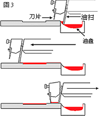 在這個(gè)設(shè)計(jì)中,油墨是放于鋼板后的油盤里(圖3)。印刷時(shí),油墨會(huì)被油掃刮到鋼板上。這時(shí)候,油盤會(huì)被這個(gè)橫移的組件遮蓋,減少溶劑揮發(fā)。油盤實(shí)際上沒(méi)有完全被覆蓋,但卻能阻止溶劑揮發(fā)。比較開(kāi)放式油盤,油墨濃度更穩(wěn)定,作用亦更持久。