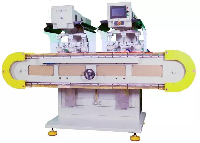 多色移印機(jī)又會(huì)根據(jù)各色之間的傳動(dòng)方式不一樣分為穿梭式和輸送帶式多色移印機(jī)。